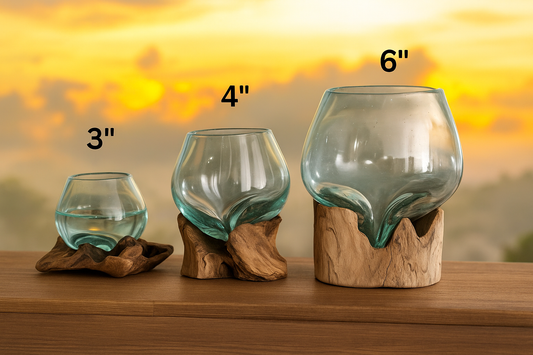 Melted Glass Vase on Teakwood – Handcrafted Organic Wood & Glass Decor